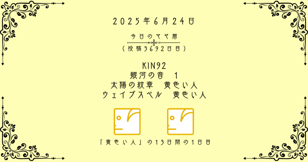 今日から「黄色い人」の13日間が始まります。この13日間で達成したいこと、叶えたいことを紙に書いて、目につくところに貼ったりして見てください。無意識の部分にまで擦り込まれることで、それが叶う確率が上がります。「音1」の日である今日は、引き寄せる力が強いので、その確率がさらに上がりますよ!