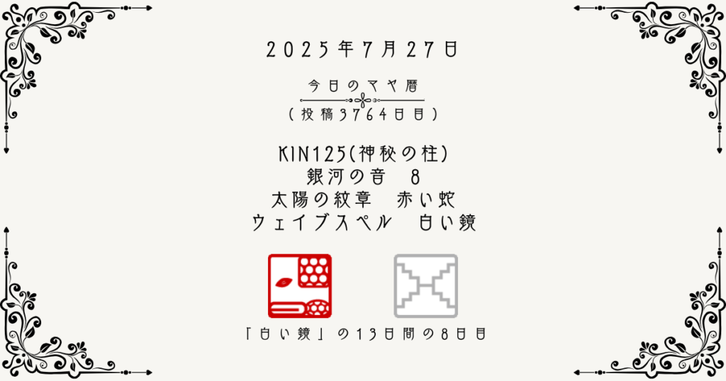 【今日のマヤ暦】7月27日 KIN125(神秘の柱) 音8 赤い蛇 – 白い鏡