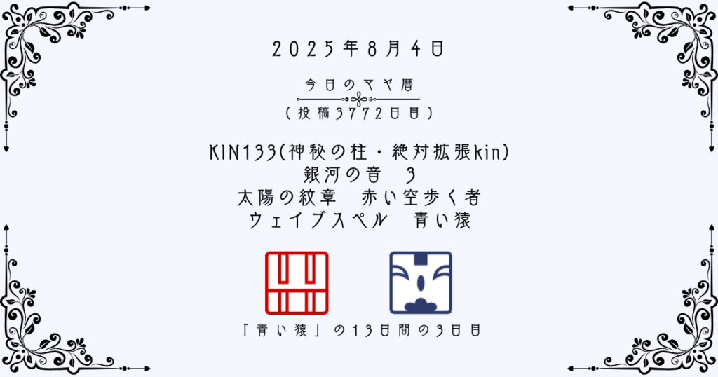 【今日のマヤ暦】8月4日 KIN133(神秘の柱・絶対拡張kin) 音3 赤い空歩く者 – 青い猿