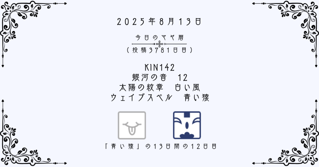 【今日のマヤ暦】8月13日 KIN142 音12 白い風 – 青い猿