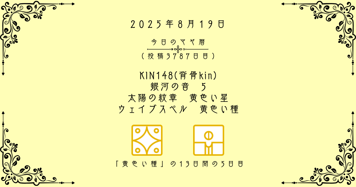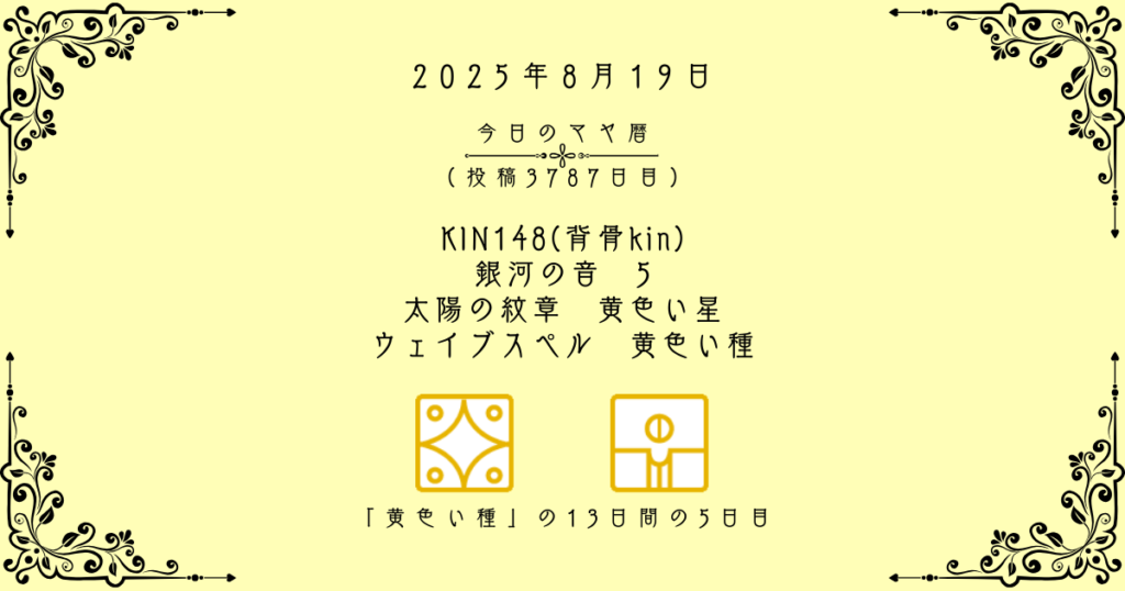 【今日のマヤ暦】8月19日 KIN148(背骨kin) 音5 黄色い星 – 黄色い種