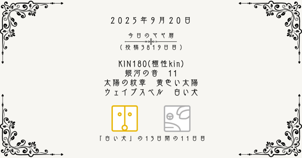 【今日のマヤ暦】9月20日 KIN180(極性kin) 音11 黄色い太陽 – 白い犬