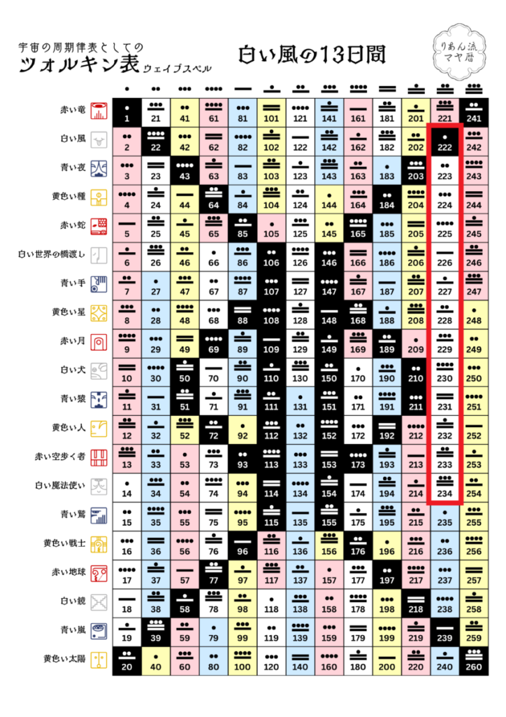 「白い風」の13日間(Kin 222~Kin 234)は、「感性」と「共感」をテーマに、内面を見つめる大切な期間です。