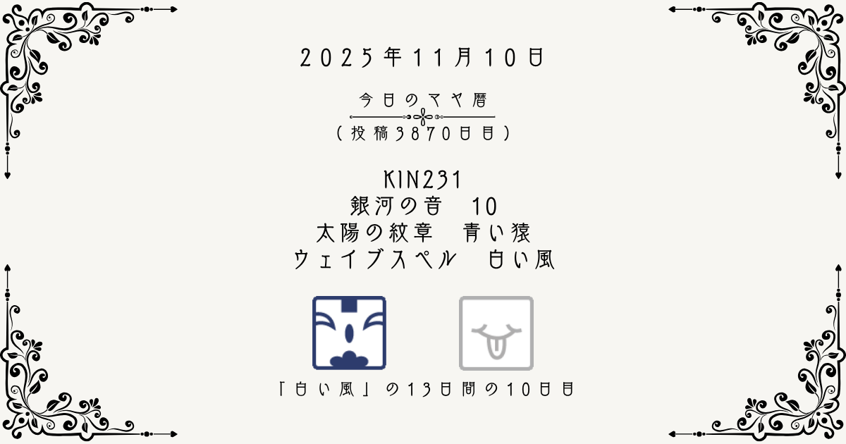 【今日のマヤ暦】11月10日 KIN231 音10 青い猿 – 白い風