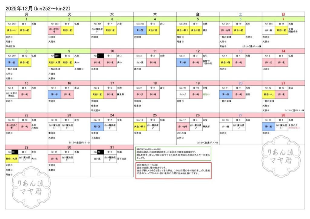 この表だと、今日がどのKINなのかが分かりにくいので、太陽暦(グレゴリオ暦)のカレンダーに合わせて作ったのがりあんのマヤ暦カレンダーです。