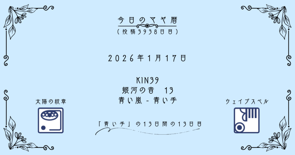 青い手(Kin27~Kin39)の期間は、相手の立場に立って思いやりを持ち、現状を冷静に把握しながら、一つひとつのことを最後まで丁寧に行動に移していきましょう。