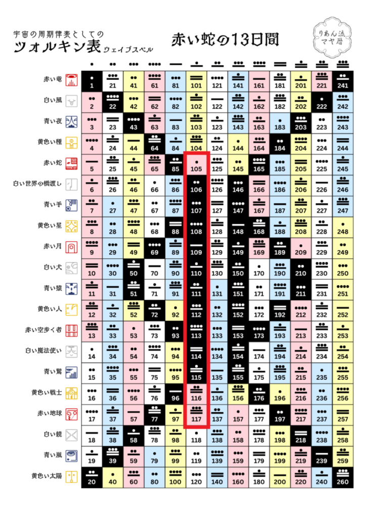 「赤い蛇」の13日(kin105~kin117)の期間は、自分の心が熱くなることに対して、真っ直ぐに情熱を持って取り組んでください。
