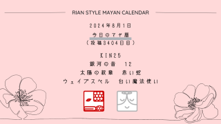今日のマヤ暦 8月1日【今日のマヤ暦】KIN25 音12 赤い蛇 – 白い魔法使い こんにちは、マヤ暦鑑定歴13年目の りあん です。今日一日の過ごし方「チェックポイント」をお届けします。マヤ暦は、毎日それぞれ違ったエネルギーが流れているという考え方をします。そのエネルギーを意識して生きることで、シンクロを呼び、リズムに乗... 2024.08.01 今日のマヤ暦