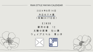 今日のマヤ暦 8月14日【今日のマヤ暦】KIN38(絶対拡張kin) 音12 白い鏡 – 青い手 こんにちは、マヤ暦鑑定歴13年目の りあん です。今日一日の過ごし方「チェックポイント」をお届けします。マヤ暦は、毎日それぞれ違ったエネルギーが流れているという考え方をします。そのエネルギーを意識して生きることで、シンクロを呼び、リズムに乗... 2024.08.14 今日のマヤ暦