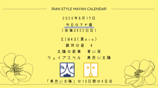 今日のマヤ暦 8月19日【今日のマヤ暦】KIN43(黒kin) 音4 青い夜 – 黄色い太陽 こんにちは、マヤ暦鑑定歴13年目の りあん です。今日一日の過ごし方「チェックポイント」をお届けします。マヤ暦は、毎日それぞれ違ったエネルギーが流れているという考え方をします。そのエネルギーを意識して生きることで、シンクロを呼び、リズムに乗... 2024.08.19 今日のマヤ暦