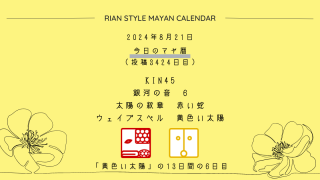 今日のマヤ暦 【今日のマヤ暦】8月21日 KIN45 音6 赤い蛇 – 黄色い太陽 こんにちは、マヤ暦鑑定歴13年目の りあん です。今日一日の過ごし方「チェックポイント」をお届けします。マヤ暦は、毎日それぞれ違ったエネルギーが流れているという考え方をします。そのエネルギーを意識して生きることで、シンクロを呼び、リズムに乗... 2024.08.21 今日のマヤ暦