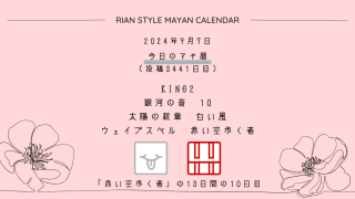 今日のマヤ暦 【今日のマヤ暦】9月7日 KIN62 音10 白い風 – 赤い空歩く者 こんにちは、マヤ暦鑑定歴13年目の りあん です。今日一日の過ごし方「チェックポイント」をお届けします。マヤ暦は、毎日それぞれ違ったエネルギーが流れているという考え方をします。そのエネルギーを意識して生きることで、シンクロを呼び、リズムに乗... 2024.09.07 今日のマヤ暦
