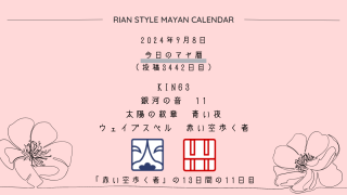 今日のマヤ暦 【今日のマヤ暦】9月8日 KIN63 音11 青い夜 – 赤い空歩く者 こんにちは、マヤ暦鑑定歴13年目の りあん です。今日一日の過ごし方「チェックポイント」をお届けします。マヤ暦は、毎日それぞれ違ったエネルギーが流れているという考え方をします。そのエネルギーを意識して生きることで、シンクロを呼び、リズムに乗... 2024.09.08 今日のマヤ暦
