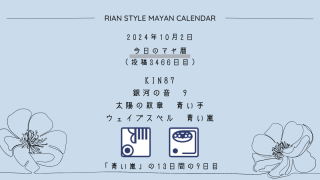 今日のマヤ暦 【今日のマヤ暦】10月2日 KIN87 音9 青い手 – 青い嵐 こんにちは、マヤ暦鑑定歴13年目の りあん です。今日一日の過ごし方「チェックポイント」をお届けします。マヤ暦は、毎日それぞれ違ったエネルギーが流れているという考え方をします。そのエネルギーを意識して生きることで、シンクロを呼び、リズムに乗... 2024.10.02 今日のマヤ暦