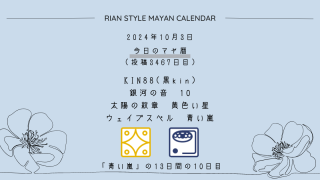 今日のマヤ暦 【今日のマヤ暦】10月3日 KIN88(黒kin) 音10 黄色い星 – 青い嵐 こんにちは、マヤ暦鑑定歴13年目の りあん です。今日一日の過ごし方「チェックポイント」をお届けします。マヤ暦は、毎日それぞれ違ったエネルギーが流れているという考え方をします。そのエネルギーを意識して生きることで、シンクロを呼び、リズムに乗... 2024.10.03 今日のマヤ暦
