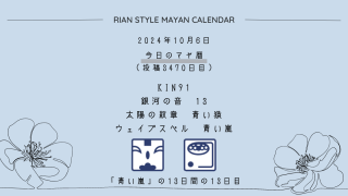 今日のマヤ暦 【今日のマヤ暦】10月6日 KIN91 音13 青い猿 – 青い嵐 こんにちは、マヤ暦鑑定歴13年目の りあん です。今日一日の過ごし方「チェックポイント」をお届けします。マヤ暦は、毎日それぞれ違ったエネルギーが流れているという考え方をします。そのエネルギーを意識して生きることで、シンクロを呼び、リズムに乗... 2024.10.06 今日のマヤ暦