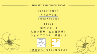 今日のマヤ暦 【今日のマヤ暦】10月9日 KIN94 音3 白い魔法使い – 黄色い人 こんにちは、マヤ暦鑑定歴13年目の りあん です。今日一日の過ごし方「チェックポイント」をお届けします。マヤ暦は、毎日それぞれ違ったエネルギーが流れているという考え方をします。そのエネルギーを意識して生きることで、シンクロを呼び、リズムに乗... 2024.10.09 今日のマヤ暦