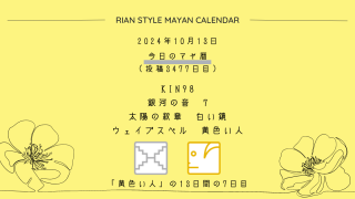 今日のマヤ暦 【今日のマヤ暦】10月13日 KIN98 音7 白い鏡 – 黄色い人 こんにちは、マヤ暦鑑定歴13年目の りあん です。今日一日の過ごし方「チェックポイント」をお届けします。マヤ暦は、毎日それぞれ違ったエネルギーが流れているという考え方をします。そのエネルギーを意識して生きることで、シンクロを呼び、リズムに乗... 2024.10.13 今日のマヤ暦