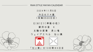 今日のマヤ暦 【今日のマヤ暦】11月5日 KIN121(神秘の柱) 音4 赤い竜 – 白い鏡 こんにちは、マヤ暦鑑定歴13年目の りあん です。今日一日の過ごし方「チェックポイント」をお届けします。マヤ暦は、毎日それぞれ違ったエネルギーが流れているという考え方をします。そのエネルギーを意識して生きることで、シンクロを呼び、リズムに乗... 2024.11.05 今日のマヤ暦
