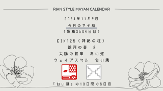 今日のマヤ暦 【今日のマヤ暦】11月9日 KIN125(神秘の柱) 音8 赤い蛇 – 白い鏡 こんにちは、マヤ暦鑑定歴13年目の りあん です。今日一日の過ごし方「チェックポイント」をお届けします。マヤ暦は、毎日それぞれ違ったエネルギーが流れているという考え方をします。そのエネルギーを意識して生きることで、シンクロを呼び、リズムに乗... 2024.11.09 今日のマヤ暦