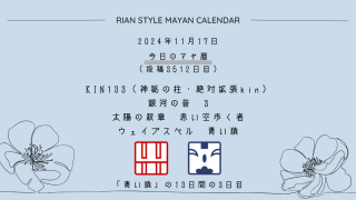 今日のマヤ暦 【今日のマヤ暦】11月17日 KIN133(神秘の柱・絶対拡張kin) 音3 赤い空歩く者 – 青い猿 こんにちは、マヤ暦鑑定歴13年目の りあん です。今日一日の過ごし方「チェックポイント」をお届けします。マヤ暦は、毎日それぞれ違ったエネルギーが流れているという考え方をします。そのエネルギーを意識して生きることで、シンクロを呼び、リズムに乗... 2024.11.17 今日のマヤ暦