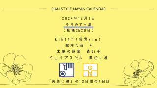 今日のマヤ暦 【今日のマヤ暦】12月1日 KIN147(背骨kin) 音4 青い手 – 黄色い種 こんにちは、マヤ暦鑑定歴13年目の りあん です。今日一日の過ごし方「チェックポイント」をお届けします。マヤ暦は、毎日それぞれ違ったエネルギーが流れているという考え方をします。そのエネルギーを意識して生きることで、シンクロを呼び、リズムに乗... 2024.12.01 今日のマヤ暦
