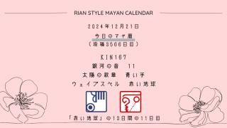 今日のマヤ暦 【今日のマヤ暦】12月21日 KIN167 音11 青い手 – 赤い地球 こんにちは、マヤ暦鑑定歴13年目の りあん です。「今日のマヤ暦」を日々活用していただきありがとうございます!その悩み、原因がわからないまま、このまま放っておきますか?見て見ぬふりをしていても、心のモヤモヤはいつか大きくなって、あなたの未来... 2024.12.21 今日のマヤ暦