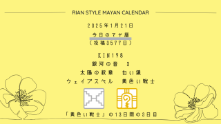 今日のマヤ暦 【今日のマヤ暦】1月21日 KIN198 音3 白い鏡 – 黄色い戦士 こんにちは、マヤ暦鑑定歴13年目の りあん です。「今日のマヤ暦」を日々活用していただきありがとうございます!今日一日の過ごし方「チェックポイント」をお届けします。マヤ暦は、毎日それぞれ違ったエネルギーが流れているという考え方をします。その... 2025.01.21 今日のマヤ暦
