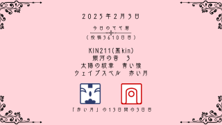 今日のマヤ暦 【今日のマヤ暦】2月3日 KIN211(黒kin) 音3 青い猿 – 赤い月 こんにちは、マヤ暦鑑定歴13年目の りあん です。「今日のマヤ暦」を日々活用していただきありがとうございます!今日一日の過ごし方「チェックポイント」をお届けします。マヤ暦は、毎日それぞれ違ったエネルギーが流れているという考え方をします。その... 2025.02.03 今日のマヤ暦