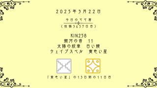 今日のマヤ暦 【今日のマヤ暦】3月22日 KIN258 音11 白い鏡 – 黄色い星 こんにちは、マヤ暦鑑定歴13年目の りあん です。「今日のマヤ暦」を日々活用していただきありがとうございます!今日一日の過ごし方「チェックポイント」をお届けします。マヤ暦は、毎日それぞれ違ったエネルギーが流れているという考え方をします。その... 2025.03.22 今日のマヤ暦