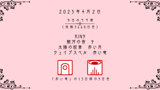 今日のマヤ暦 【今日のマヤ暦】4月2日 KIN9 音9 赤い月 – 赤い竜 こんにちは、マヤ暦鑑定歴13年目の りあん です。「今日のマヤ暦」を日々活用していただきありがとうございます!今日一日の過ごし方「チェックポイント」をお届けします。マヤ暦は、毎日それぞれ違ったエネルギーが流れているという考え方をします。その... 2025.04.02 今日のマヤ暦