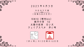 今日のマヤ暦 【今日のマヤ暦】4月3日 KIN10(極性kin) 音10 白い犬 – 赤い竜 こんにちは、マヤ暦鑑定歴13年目の りあん です。「今日のマヤ暦」を日々活用していただきありがとうございます!今日一日の過ごし方「チェックポイント」をお届けします。マヤ暦は、毎日それぞれ違ったエネルギーが流れているという考え方をします。その... 2025.04.03 今日のマヤ暦