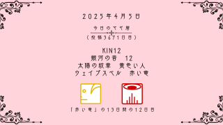 今日のマヤ暦 【今日のマヤ暦】4月5日 KIN12 音12 黄色い人 – 赤い竜 こんにちは、マヤ暦鑑定歴13年目の りあん です。「今日のマヤ暦」を日々活用していただきありがとうございます!今日一日の過ごし方「チェックポイント」をお届けします。マヤ暦は、毎日それぞれ違ったエネルギーが流れているという考え方をします。その... 2025.04.05 今日のマヤ暦