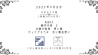 今日のマヤ暦 【今日のマヤ暦】4月8日 KIN15 音2 青い鷲 – 白い魔法使い こんにちは、マヤ暦鑑定歴13年目の りあん です。「今日のマヤ暦」を日々活用していただきありがとうございます!今日一日の過ごし方「チェックポイント」をお届けします。マヤ暦は、毎日それぞれ違ったエネルギーが流れているという考え方をします。その... 2025.04.08 今日のマヤ暦