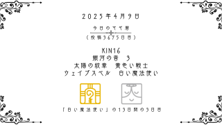 今日のマヤ暦 【今日のマヤ暦】4月9日 KIN16 音3 黄色い戦士 – 白い魔法使い こんにちは、マヤ暦鑑定歴13年目の りあん です。「今日のマヤ暦」を日々活用していただきありがとうございます!今日一日の過ごし方「チェックポイント」をお届けします。マヤ暦は、毎日それぞれ違ったエネルギーが流れているという考え方をします。その... 2025.04.09 今日のマヤ暦