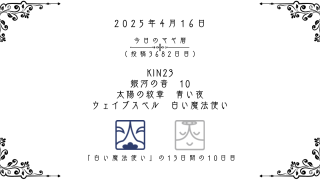 今日のマヤ暦 【今日のマヤ暦】4月16日 KIN23 音10 青い夜 – 白い魔法使い こんにちは、マヤ暦鑑定歴13年目の りあん です。「今日のマヤ暦」を日々活用していただきありがとうございます!今日一日の過ごし方「チェックポイント」をお届けします。マヤ暦は、毎日それぞれ違ったエネルギーが流れているという考え方をします。その... 2025.04.16 今日のマヤ暦