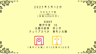今日のマヤ暦 【今日のマヤ暦】5月12日 KIN49 音10 赤い月 – 黄色い太陽 こんにちは、マヤ暦鑑定歴13年目の りあん です。「今日のマヤ暦」を日々活用していただきありがとうございます!今日一日の過ごし方「チェックポイント」をお届けします。マヤ暦は、毎日それぞれ違ったエネルギーが流れているという考え方をします。その... 2025.05.12 今日のマヤ暦