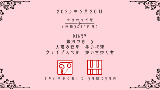 今日のマヤ暦 【今日のマヤ暦】5月20日 KIN57(絶対拡張kin) 音5 赤い地球 – 赤い空歩く者 こんにちは、マヤ暦鑑定歴13年目の りあん です。「今日のマヤ暦」を日々活用していただきありがとうございます!今日一日の過ごし方「チェックポイント」をお届けします。マヤ暦は、毎日それぞれ違ったエネルギーが流れているという考え方をします。その... 2025.05.20 今日のマヤ暦