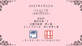 今日のマヤ暦 【今日のマヤ暦】5月22日 KIN59 音7 青い嵐 – 赤い空歩く者 こんにちは、マヤ暦鑑定歴13年目の りあん です。「今日のマヤ暦」を日々活用していただきありがとうございます!今日一日の過ごし方「チェックポイント」をお届けします。マヤ暦は、毎日それぞれ違ったエネルギーが流れているという考え方をします。その... 2025.05.22 今日のマヤ暦