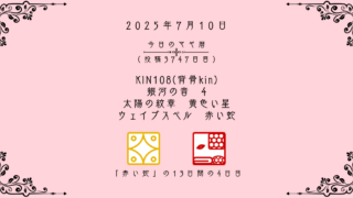 今日のマヤ暦 【今日のマヤ暦】7月10日 KIN108(背骨kin) 音4 黄色い星 – 赤い蛇 こんにちは、マヤ暦鑑定歴13年目の りあん です。「今日のマヤ暦」を日々活用していただきありがとうございます!今日一日の過ごし方「チェックポイント」をお届けします。マヤ暦は、毎日それぞれ違ったエネルギーが流れているという考え方をします。その... 2025.07.10 今日のマヤ暦