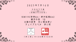 今日のマヤ暦 【今日のマヤ暦】7月16日 KIN114(背骨kin・絶対拡張kin) 音10 白い魔法使い – 赤い蛇 こんにちは、マヤ暦鑑定歴13年目の りあん です。「今日のマヤ暦」を日々活用していただきありがとうございます!今日一日の過ごし方「チェックポイント」をお届けします。マヤ暦は、毎日それぞれ違ったエネルギーが流れているという考え方をします。その... 2025.07.16 今日のマヤ暦