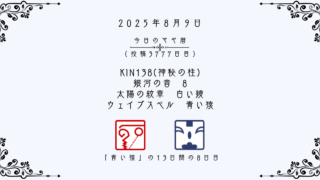 今日のマヤ暦 【今日のマヤ暦】8月9日 KIN138(神秘の柱) 音8 白い鏡 – 青い猿 こんにちは、マヤ暦鑑定歴13年目の りあん です。「今日のマヤ暦」を日々活用していただきありがとうございます!今日一日の過ごし方「チェックポイント」をお届けします。マヤ暦は、毎日それぞれ違ったエネルギーが流れているという考え方をします。その... 2025.08.09 今日のマヤ暦