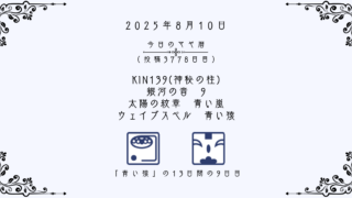 今日のマヤ暦 【今日のマヤ暦】8月10日 KIN139(神秘の柱) 音9 青い嵐 – 青い猿 こんにちは、マヤ暦鑑定歴13年目の りあん です。「今日のマヤ暦」を日々活用していただきありがとうございます!今日一日の過ごし方「チェックポイント」をお届けします。マヤ暦は、毎日それぞれ違ったエネルギーが流れているという考え方をします。その... 2025.08.10 今日のマヤ暦