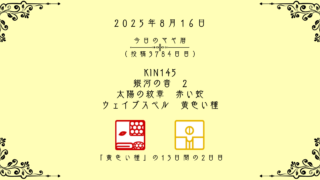 今日のマヤ暦 【今日のマヤ暦】8月16日 KIN145 音2 赤い蛇 – 黄色い種 こんにちは、マヤ暦鑑定歴13年目の りあん です。「今日のマヤ暦」を日々活用していただきありがとうございます!今日一日の過ごし方「チェックポイント」をお届けします。マヤ暦は、毎日それぞれ違ったエネルギーが流れているという考え方をします。その... 2025.08.16 今日のマヤ暦