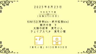 今日のマヤ暦 【今日のマヤ暦】8月23日 KIN152(背骨kin・絶対拡張kin) 音9 黄色い人 – 黄色い種 こんにちは、マヤ暦鑑定歴13年目の りあん です。「今日のマヤ暦」を日々活用していただきありがとうございます!今日一日の過ごし方「チェックポイント」をお届けします。マヤ暦は、毎日それぞれ違ったエネルギーが流れているという考え方をします。その... 2025.08.23 今日のマヤ暦