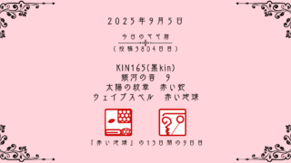 今日のマヤ暦 【今日のマヤ暦】9月5日 KIN165(黒kin) 音9 赤い蛇 – 赤い地球 こんにちは、マヤ暦鑑定歴13年目の りあん です。「今日のマヤ暦」を日々活用していただきありがとうございます!今日一日の過ごし方「チェックポイント」をお届けします。マヤ暦は、毎日それぞれ違ったエネルギーが流れているという考え方をします。その... 2025.09.05 今日のマヤ暦