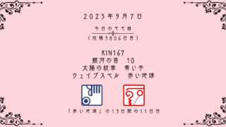 今日のマヤ暦 【今日のマヤ暦】9月7日 KIN167 音11 青い手 – 赤い地球 こんにちは、マヤ暦鑑定歴13年目の りあん です。「今日のマヤ暦」を日々活用していただきありがとうございます!今日一日の過ごし方「チェックポイント」をお届けします。マヤ暦は、毎日それぞれ違ったエネルギーが流れているという考え方をします。その... 2025.09.07 今日のマヤ暦