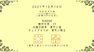 今日のマヤ暦 【今日のマヤ暦】10月18日 KIN208 音13 黄色い星 – 黄色い戦士 こんにちは、マヤ暦鑑定歴13年目の りあん です。「今日のマヤ暦」を日々活用していただきありがとうございます!今日一日の過ごし方「チェックポイント」をお届けします。マヤ暦は、毎日それぞれ違ったエネルギーが流れているという考え方をします。その... 2025.10.18 今日のマヤ暦