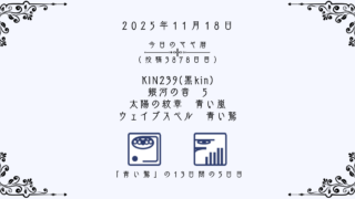 今日のマヤ暦 【今日のマヤ暦】11月18日 KIN239(黒kin) 音5 青い嵐 – 青い鷲 こんにちは、マヤ暦鑑定歴13年目の りあん です。「今日のマヤ暦」を日々活用していただきありがとうございます!今日一日の過ごし方「チェックポイント」をお届けします。マヤ暦は、毎日それぞれ違ったエネルギーが流れているという考え方をします。その... 2025.11.18 今日のマヤ暦