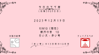 今日のマヤ暦 【今日のマヤ暦】12月19日 KIN10(極性kin) 音10 白い犬 – 赤い竜 こんにちは、マヤ暦鑑定歴13年目の りあん です。「今日のマヤ暦」を日々活用していただきありがとうございます!今日一日の過ごし方「チェックポイント」をお届けします。マヤ暦は、毎日それぞれ違ったエネルギーが流れているという考え方をします。その... 2025.12.19 今日のマヤ暦